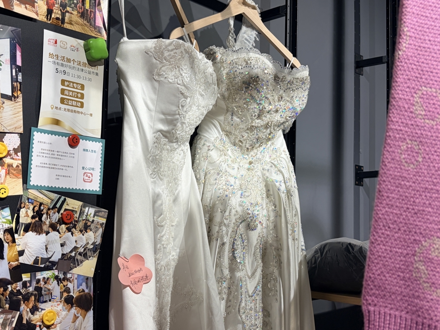 比如两件来自云南西双版纳的婚纱,标签上写着捐赠者的寄语:“幸福传递”。店员介绍,这是去年一位新婚旅行途经上海的新娘捐赠的主婚纱与副婚纱,“她捐赠后还主动询问,能不能为公益多尽一份力”。考虑到这件婚纱承载的特殊意义,门店决定暂不标价,“它是无价的,我们等待一位有缘人,让这份幸福延续”。
